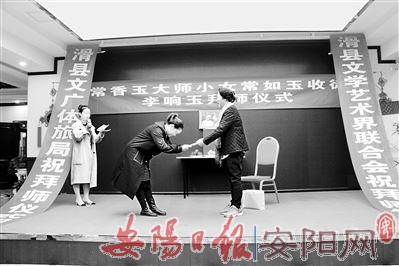 滑县豫剧团青年演员李响玉天姿聪慧、勤奋好学,十分仰慕常派艺术,经常向豫剧大师常香玉女儿、常派传人、河南省常香玉基金会负责人常如玉请教。常如玉对她极为喜欢。经滑县豫剧团团长于录勤牵线搭桥,常如玉收李响玉为徒,并于10月18日举行了收徒仪式。(李宝华 摄)