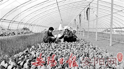 城关街道刘店村程先生老两口身体硬朗,精神矍铄,虽然年过7旬,但仍种了0.1公顷大棚蔬菜,年收入2万余元,既锻炼了身体,又增加了收入。眼下,棚内小葱苗长势正旺,嫩绿的油白菜格外喜人。图为11月12日,程先生夫妇及一位帮忙的邻居正在大棚内收油白菜。(本报特约记者 徐淑霞 摄)