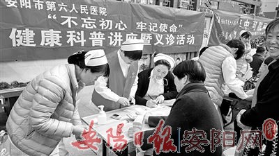 本报讯 为扎实开展“不忘初心、牢记使命”主题教育,发挥共产党员的先锋模范作用,11月8日上午,市第六人民医院内科党支部到汪家店社区开展了义诊活动。