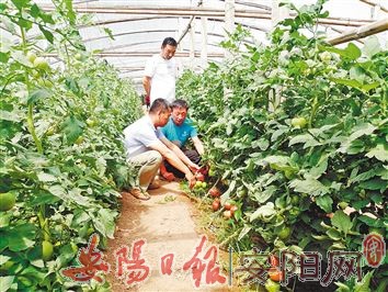 “7栋大棚占地20多亩,2栋温室占地5亩。成立的合作社有200多户村民,有850栋温室、大棚,占地约3000亩。”5月27日,安阳县韩陵镇梨园村村民李光福在自家的西红柿大棚里一边忙碌,一边对记者说。早春茬西红柿的第一穗果正在采摘期,李光福一家人忙不过来,还找了附近的村民来帮忙采摘。“俺这棚向东100多米就是河北临漳。我们雇的小时工多是临漳人,一个小时7元钱。”早春栽的西红柿只收四穗果,现在采摘的是一穗果。李光福估算了一下:“一亩西红柿产量在1.5万斤左右,大约能卖个八九千元。”