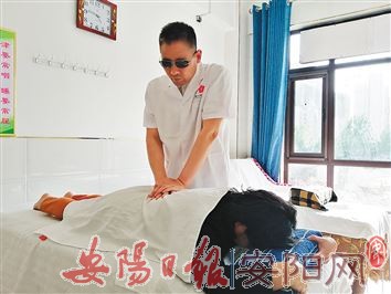 5月20日,记者来到王海红位于市梅东路南段的按摩店时,他正在与一位顾客通电话,约定到店时间。王海红带记者参观店铺,上下两层共有约20张按摩床位,每张按摩床位上都铺着雪白的床单,按摩巾也经过清洗消毒整齐叠放在床上。地面打扫得一尘不染,巨大的落地窗十分明亮。“加上这个店,我现在在市区一共有3家店。能做到今天其实挺不容易的。”王海红打开了话匣子,“我1974年出生在殷都区西郊乡,父母都是务农的。那时候家人希望我能学个一技之长,将来也不愁生计。所以,我进入卫校学医。没想到发生了意外。”王海红回忆:“我自小就高度近视,不能做剧烈运动。有一次给家里田地浇水时,有块大石头碍事,我就想着搬开它,没想到导致右眼视网膜脱落,一下子就看不见了。”后来虽然几经救治,但是由于治疗难度大、医疗费用高,王海红右眼彻底失明,随后左眼视力也急剧恶化,接近失明。王海红当时感觉天塌了一样,但他还是坚强地走出了心情低谷期:“我不能让自己一辈子活在黑暗里。虽然我身体残疾,但是我不能让我的生命也有缺憾。”