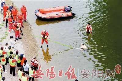 红旗渠风景区高度重视安全生产工作,积极开展安全生产月系列活动。6月11日至12日,该景区组织员工进行了系统安全知识培训、消防器材使用培训、防汛及防溺水安全演练,全面增强员工安全意识,提升应急处置能力。图为该景区与红旗渠应急救援队在络丝潭景点联合开展防溺水演练。(本报记者 刘剑昆/文 通讯员 尹迅江/图)