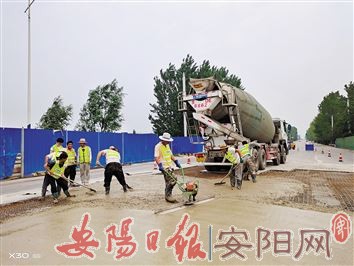 光明路洪河桥因过境车辆长期碾压造成桥面破损,为保证行人和车辆通行安全,市市政维护发展中心于6月6日开始对该桥进行半封闭维修施工,施工内容为破除原有桥面铺装层、重新铺设钢筋网、铺筑C50高标号水泥混凝土,工期25天,预计6月30日开放交通。图为6月11日,施工人员正在浇筑水泥混凝土。(邝云奇 摄)