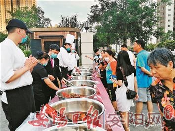 一阵阵吆喝声吸引着过往市民围观。6月16日18时,安阳东区兴泰路与文峰大道交叉口东南角,十几种新鲜的美食一字排开,安阳迎宾馆的几名工作人员身着白大褂,热情地为市民提供服务。