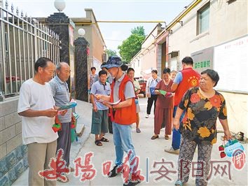 图为志愿者给村民发放文明城市创建应知应会宣传页。(本报记者 魏 兰/文 刘震/图)