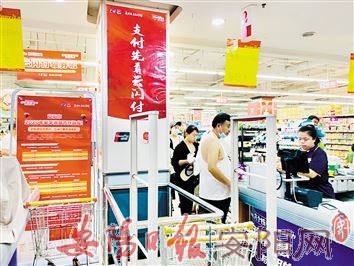 8月21日,记者来到位于黄河南路的华联优品超市,看到超市入口的电梯旁边摆放着电子惠民消费券活动展板,在每个收银台处的显眼位置也张贴了宣传页面。该超市的收银员告诉记者,最近结账用银联支付的用户明显多了起来,客流也比平时增加不少。