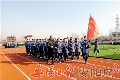 “一班一班,奋勇争先!”12月28日上午,殷都外国语中学大课间,同学们在前排旗手的带领下,迈着整齐的步伐跑步行进在崭新的塑胶跑道上,齐声呐喊,铿锵有力。