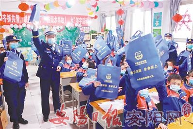 1月14日,内黄县消防救援大队联合县教育局深入全县各中小学校,向中小学生免费发放了装有一次性医用口罩、中小学生消防寒假作业、消防安全飞行棋和居民防火公约等物品和宣传资料的“假期安全大礼包”。(张英杰 摄)