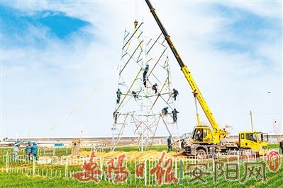 图为3月15日,施工人员在白道口镇后吾旺村组立郑济高铁220千伏电力铁塔。 (文 锟 摄)