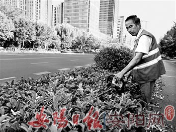 图为8月30日,园林工人在修剪永明路上的绿化带,迎接“双节”的到来。(本报记者 姚庆云 摄)
