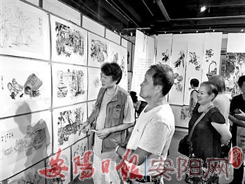 为庆祝中华人民共和国成立70周年,8月31日,刘普安艺术工作室师生美术作品展,在位于文峰大道北路的十二府开幕。我市书法、美术界人士100余人参加了开幕式。图为展览现场。(本报记者 张 璐 摄)