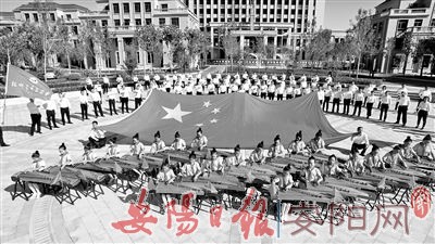 9月21日,来自林州市青年商会168个成员单位的150余人聚集在国家863红旗渠科技产业园,共同唱响《我和我的祖国》,向祖国母亲献上最真挚的祝福。(秦加福 摄)