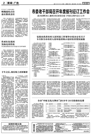 会议要求,各县(市)区、各市直单位要利用好《老人春秋》和《安阳日报·夕阳红》周刊宣传平台,特别是要利用好《安阳日报·夕阳红》周刊这个平台。《安阳日报·夕阳红》周刊每周都能与大家见面,本区域近期发生的老干部工作大事、要事都能从报纸上看到。各部门可借此平台讲本单位做好老干部工作的故事,将老干部发挥余热、服务社会、彰显正能量的先进事迹、奉献精神展示出来,并与广大老干部、老干部工作者进行有效互动,共同办好这张报纸。