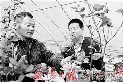 今年62岁的关叶科是城关镇西林头村村民,2012年返乡务农。他在自家的一亩三分地上大做文章:春有月季牡丹花,夏季文竹橡皮树,秋后满地菊花黄,冬季温棚百花香。目前,关老汉在滑县邮政储蓄银行的帮助下,花卉种植面积已发展到0.6公顷60多个品种。图为11月3日,在关叶科的花圃内,滑县邮政分公司城关支局工作人员焦宏宇(右)正在了解粉和平月季的长势与销售情况。