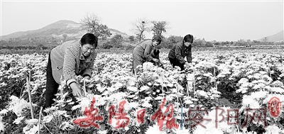 11月6日,记者在林州市河顺镇官庄村万盛农场看到,金丝皇菊开得正艳,村民有的在地头忙着采摘菊花,有的在生产车间忙着加工菊花,整个农场呈现出一派丰收景象。图为村民在采摘菊花。 (本报记者 刘剑昆 摄)