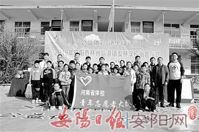 11月5日上午,河南省体育彩票管理中心安阳分中心的工作人员把“公益体彩 、快乐操场”捐赠的崭新体育器材送到了林州临淇镇梨林学校的学生手里。