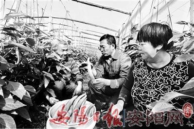 近年,西杏头村积极响应老店镇党委、镇政府号召,大力发展日光温室瓜菜生产。目前,该村有32户农民依托109栋日光温室向省会城市和周边城乡居民提供各类时令蔬菜与反季节蔬菜。图为水溶肥专家申卫东(中)正与王守铅夫妇交流种植经验。 (郭选红 摄)