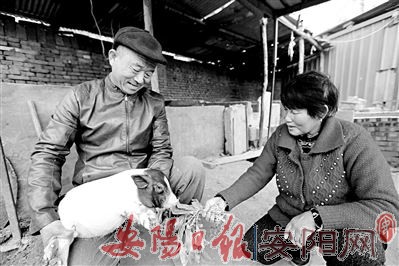 今年56岁的白道口镇农民王明存敢为人先,于前年冬季引进一对藏香猪,发展规模不断壮大,今年出栏 100多头藏香猪,收入5万元。图为11月22日,王明存和老伴儿正在给刚满月的藏香猪喂菠菜叶。(毕兴世 摄)