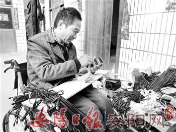 “我是赶上好时代了,县残联让我免费参加家电维修技术培训,后来又安排我实习,听说我开了残疾人爱心服务站,又给我配备了各种维修工具。”黄爱民说,“我陆续参加了几次县残联组织的培训,今年上半年还学习了制作数据线、电脑音箱线,每天在家能加工300多条数据线。弄这个,电容的正极和负极不能接反,加工一条线我能挣1毛多,光这一项一天就能挣30多元。”