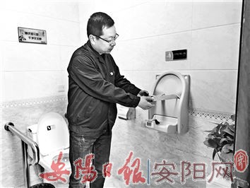 紧接着,他转身走进公厕内,伸手摸了摸洗手池台面和水龙头,又仔细地检查了孕婴专用卫生间的婴儿座椅,微笑着向记者介绍:“设备完好无损、台面干净整洁,手摸上去没有一点灰尘,这就是文峰区环卫人的工作标准。”