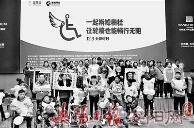12月3日是第二十八个国际残疾人日。当天,壹基金、全国脑瘫网络在我市举办城市无障碍公益“有爱无碍欢乐行”大型启动仪式。安阳博爱特教、绿丝带公益等爱心单位共同开展城市无障碍倡导活动,其目的是方便脑瘫儿童、老人、孩子、孕妇以及有特殊需要的残障人士出行。图为启动仪式现场。(李光瑞 摄)