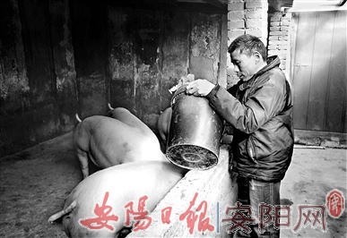 在永和镇政府、安阳县供电公司帮助下,郭奇村贫困户郭保申申领到5万元小额贷款贷款,发展养猪项目,摆脱了贫困。图为12月12日,永和镇郭奇村村民郭保申在喂猪。 (本报记者 姜蕴真 摄)