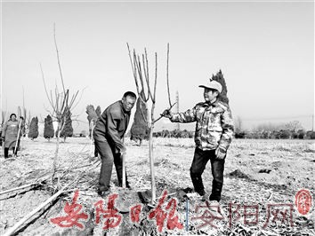 为改善农村人居环境,推进美丽乡村建设,岳飞故里汤阴县菜园镇程岗村村民利用冬闲时节植树,美化家园。图为昨天,村民在省道通往村庄的道路两旁栽种海棠树 。(本报记者 郭晓东 摄)