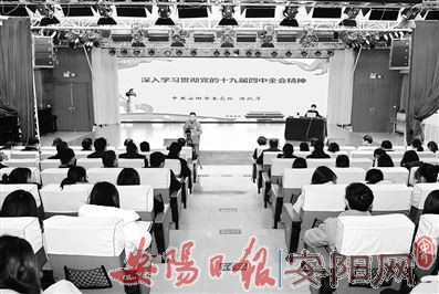 10月23日,学校分别邀请林州市副市长李蕾,安阳市总工会党组成员、女职工委员会主任、全市“不忘初心、牢记使命”主题教育宣讲团团长张艾敏,省优秀教师、安阳市最美教师、安阳市第一实验小学教师屈霞,市优秀教师、安阳市自由路小学教师吴献红等人到学校作学习交流报告。11月6日,学校邀请省委党校田宪臣教授作题为《习近平新时代中国特色社会主义思想学习纲要》解读专题报告,对深入理解和把握习近平新时代中国特色社会主义思想的核心要义、精神实质、丰富内涵和实践具有重要的指导意义。11月27日,市委党校中华文化教研部副主任陈晓萍以《深入学习贯彻党的十九届四中全会精神》为题,到学校宣讲党的十九届四中全会精神。学校各党支部书记除带头引领党员共同学习研读《习近平关于“不忘初心、牢记使命”重要论述摘编》《党章》《党规》和系列讲话外,还通过微信群、学习强国等进行远程教育、视频讨论,确保集中学习、专题讨论能够覆盖党支部全体党员。