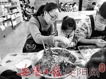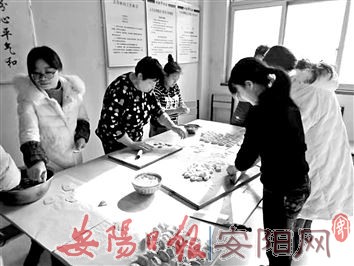 图①:解放路街道和平路社区志愿者在为社区老人包饺子。(魏远方 摄)