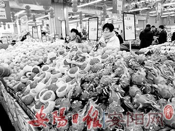 除了蔬菜,市场上的水果供应也很充足。在李家庄水果市场,虽然人流量没有蔬菜市场大,但货源充足,色泽鲜艳的苹果堆成了小山,刚送来的橘子一筐一筐地码放整齐。卖橘子的商户郑国军说:“每天来批发的、零买的客户不断,快过春节了,我也要备足货,不能错过这个市场销售旺季。”