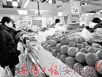 在安泰苑附近的农贸市场,商户田贵英和帮工正忙着给客户称菜。凌晨,他们刚从李家庄蔬菜市场把新鲜的蔬菜购进来,经过整理,西红柿、黄瓜、菠菜、莴笋等种类齐全、色泽鲜艳的蔬菜摆上了柜台。田贵英告诉记者:“我们的菜都是当天购入当天卖,保证新鲜。目前,菜价与往常持平,估计春节前价格会上涨一些。”
