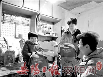 今年12岁的乐乐(化名)和7岁的旭旭(化名)是一对姐妹,和父母、奶奶在一起生活。她们的父亲因伤双目失明,母亲先天双目失明。姐妹俩也不同程度存在弱视等视力问题。2017年,姐妹俩在市瞳光眼科光学中心矫治视力。该机构负责人了解到姐妹俩的家庭情况后,为她们减免了部分医疗费用,并通过全市“一帮一”扶困助学活动对她们进行帮扶。图为1月20日,该机构负责人焦国帅给乐乐一家送去米、面、油,并给姐妹俩送去了新书包,祝他们全家新年快乐。(本报记者 葛建霞 摄)