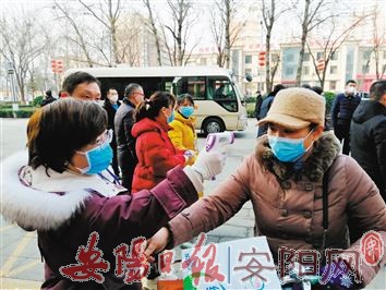 1月28日,在龙安区元泰园中园小区门口,社区工作人员手持体温测量仪,对进出小区的居民进行体温测量。