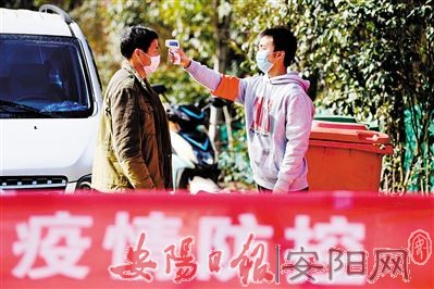 2月13日,潘秦在肥西县紫蓬镇燎原社区路口为来往村民测量体温。