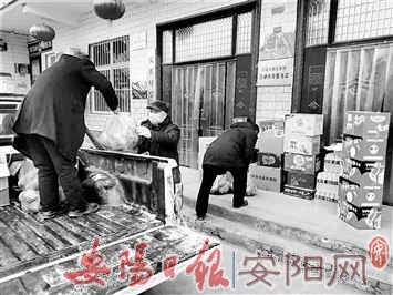 白道口镇民寨村与新冠肺炎确诊病例密切接触人员都在家进行隔离,不方便外出购物,镇、村干部每天为他们采购生活物资送至家中。图为2月11日,该村干部正在搬卸统一购买的生活物资。(本报特约记者 徐淑霞/文 通讯员 耿 昆/图)