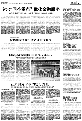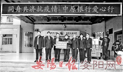 2月12日,中原银行安阳分行行长聂国庆、纪委书记王莉敏、行长助理武拥军将第一批价值4万余元的防疫物资送达安阳地区医院、高新区公安局防疫指挥部和马投涧镇政府。2月12至13日,中原银行安阳分行开展县域地区专项捐赠活动,将价值9万元的防疫物资捐赠给了县域一线防疫单位。中原银行安阳分行副行长王运平、行长助理武拥军代表安阳分行向内黄县中医院、林州市人民医院、汤阴县人民医院等单位捐赠防疫物资,滑县支行、水冶支行代表安阳分行向滑县中心医院、安阳县人民医院等单位捐赠防疫物资。2月13日,中原银行安阳分行行长聂国庆、副行长牛振平、行长助理武拥军将第二批价值10万余元的防疫物资送达安阳市第六人民医院、安阳市妇幼保健院、高新区管委会、灯塔路街道办事处、殷都区政府、安阳县卫健委和夕阳红疗养院。2月14日,牛振平、武拥军及该行行长助理兼风险总监孙刚将第三批价值2万余元的防疫物资送达安阳市永明路街道办事处、安阳县卫健委、安阳市第二人民医院。2月18日,武拥军将第四批价值2万余元的防疫物资送达文峰区政府及安阳市肿瘤医院。