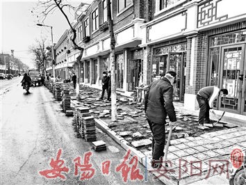 随着疫情得到有效控制,汤阴县政通路、卫生街综合提升改造工程正式复工。本次施工内容包括更换人行道板砖、景观灯、供水管道以及强电、弱电入地等工程。据了解,县住建局严格按照市、县相关复工复产要求,指导相关项目做好防疫工作,制订了详细的疫情防控方案、应急预案、复工方案等。图为3月4日,在政通大道上,工人将旧路沿石、道板砖回收用于市政维护。