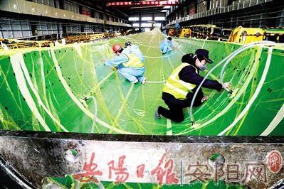 位于我市中原高新技术产业开发区的中复连众复合材料集团有限公司安阳分公司自2月17日复工以来,主打产品风力发电叶片目前产销两旺,市场供不应求。由于产量有限,许多客户发来的订单都无法接收。该公司目前正在建设的二期项目总投资3亿元,建成后可实现年产76米以下叶片500套。图为该公司注胶班组正在进行叶片灌注作业。