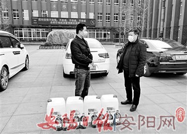 疫情发生以来,志亮爱心公益团队多方筹措防疫物资,先后向周十小学、健康路小学、高新区第一小学、殷都外国语中学、九府幼儿园等学校捐赠84消毒液、医用酒精、方便面、矿泉水、面包等物资,助力学校抗疫。图为3月2日,志亮爱心公益团队负责人陈志亮向高新区第一小学捐赠消毒液和酒精等防疫物资。(本报记者 韩镔肇 摄)