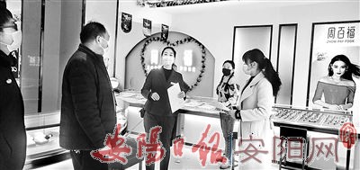 近日,牛屯镇在加强疫情防控的同时,由多个部门组成联合执法小组,对复工的沿街门店是否证照齐全、是否登记备案、是否张贴承诺书、环境消杀是否到位、是否做好健康登记、人员间隔是否符合规范等问题进行检查,发现问题及时指出,消除疫情传播隐患,为沿街门店商户复工复产保驾护航。图为3月10日,执法人员在门店检查。(李 伟/文 李广杰/图)