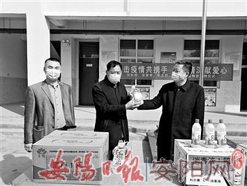 3月12日,安阳县崔家桥镇宋村屯村村民张长印代表其弟兄四人,向学校捐赠用于疫情防护的4000个一次性医用口罩、60瓶75%酒精、60瓶84消毒液,供崔家桥镇宋村屯小学和郭家庙小学疫情防护使用。图为捐赠现场。(薛金山 摄)
