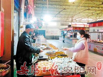 3月18日15时30分,站在龙安区清风街三家庄农贸市场南门往里看,棚顶上一个个排气扇“吱吱”转动着,不同的摊位整齐地排列起来,向远处延伸。营业高峰时段还未到,佩戴不同颜色口罩的摊主们正在为自家的生意提前做准备,包子店老板正往店里搬运面粉,凉菜摊铺老板把不同的小菜切好装进铁盘,干货调料店老板正开动机器制作辣椒面……机器轰鸣声、铁盘撞击桌面声、摊主们发出的嘈杂声交织在一起,画面忙碌却又温馨。