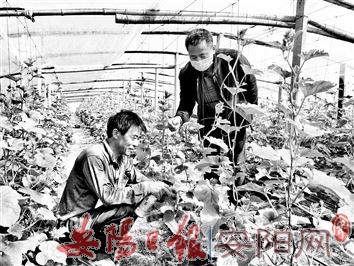 在当前战“疫”的关键时期,在脱贫攻坚收官之年,市农科院结合安阳市农业生产实际和自身优势,选派科技特派员,建设高标准展示田,搞好培训、远程连线和现场服务,为产业扶贫和乡村振兴提供强有力的科技支撑,努力把疫情对农业生产的影响减到最小。图为3月18日,市农业科学院、省大宗蔬菜产业技术体系安阳试验站专家杜瑞民(右)在内黄县亳城镇陈流村,对农民进行春大棚甜瓜生产技术现场指导。(任领兵 摄)