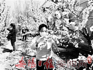 春回大地,万物复苏。在韩庄镇三禾农庄,杏树正值盛花期,白色的杏花争相绽放,处处散发着春天的气息。图为3月18日,果农正在为杏树疏花。(本报记者 郭凡 摄)