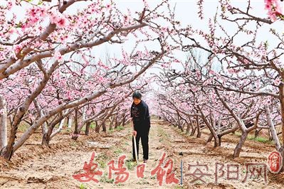 3月28日,在内黄县豆公镇田大晁村,桃花已经盛开,桃农在桃园里忙碌着。豆公镇大力发展林业经济,全镇有经济林1887公顷,其中大桃林1333公顷,大桃品种15个。该镇通过电商等途径年销售大桃150万公斤至200万公斤。(本报记者 任贵伟 摄)