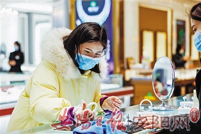 3月30日,在武汉市武商世贸广场,一名顾客(左)在挑选手镯。当日,武汉市多家商场开门迎客。