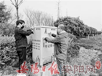 为全面提升城市形象,助力全国文明城市创建,规范和美化户外各类箱体外立面,提升景观效果,近日,安阳县城管局协调移动、联通、电信、铁塔等权属公司,对辖区43个户外箱体制订个性化美化方案,分别展现“社会主义核心价值观”“安阳城市文化”等文明元素。图为工作人员正在对户外箱体进行美化。