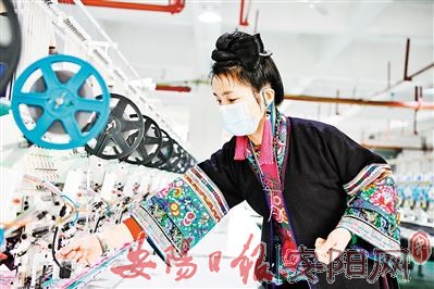 ←3月30日,在从江县贯洞镇,贵州省孔明苗侗民族绣品服务有限公司的工人在扶贫车间调试生产民族绣品的机器。