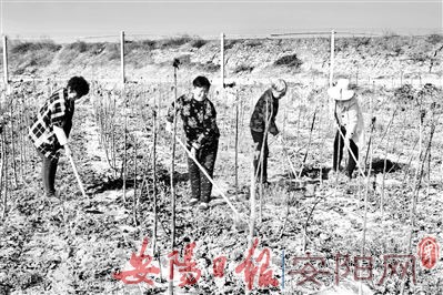 连日来,安阳县(示范区)在做好新冠肺炎疫情防控的同时,多措并举引导帮助各乡镇(街道)、各企业复工复产。图为3月27日,辛村镇东士子村群众在为楸树除草。(本报记者 刘安娜 摄)