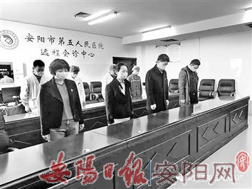当日9时30分,市第五人民医院党委书记李永红、院长助理李娟、部分科室及在岗一线医务人员,在医院远程会诊中心集中收看了央视直播《深切悼念新冠肺炎疫情牺牲烈士和逝世同胞》,10时,全院在岗人员集体默哀3分钟,120救护车鸣笛志哀。